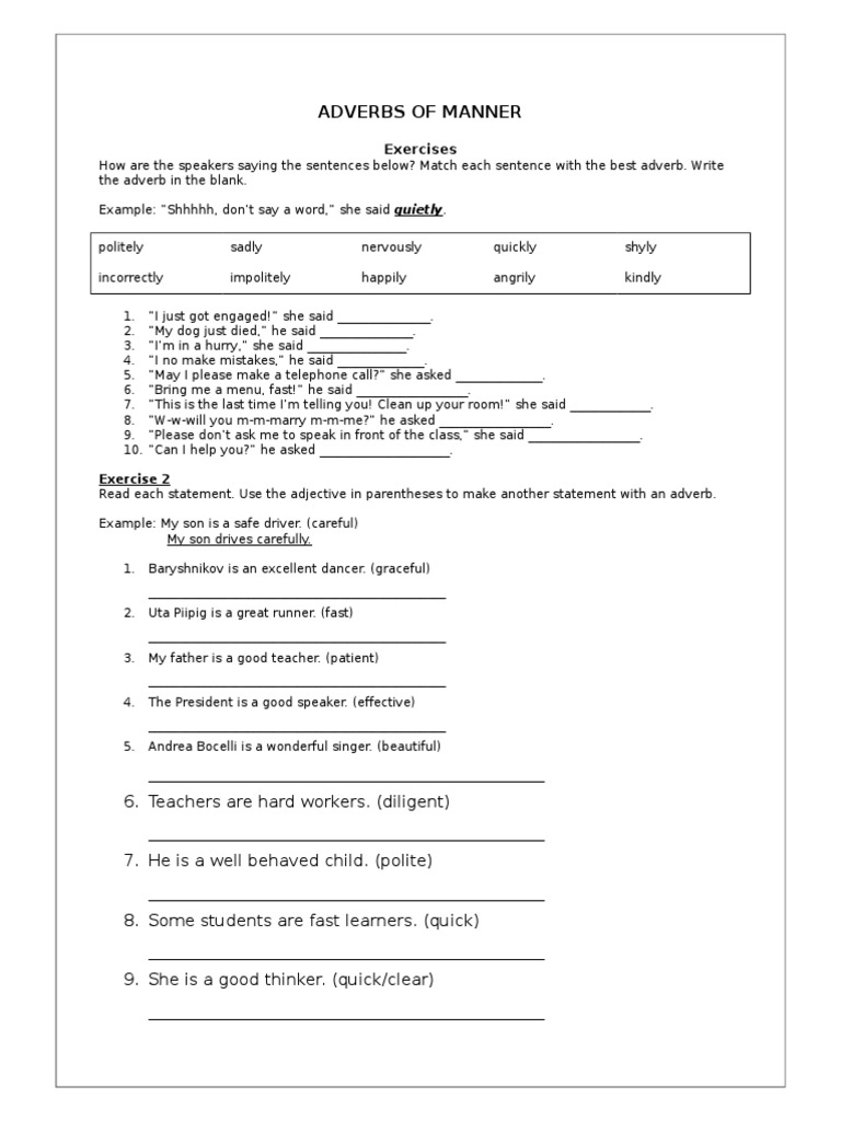 Adverb Exercises For Class 7 Cbse With Answers Cbse Sample Papers from www.cbsesamplepapers.info The following exercises will help you gain greater understanding about how adverbs of manner work. If the adverb is placed before or after the main verb. For adjectives that end with 'y' we need with phrasal verbs, the adverb of manner cannot appear between the verb and its particle. What is the adverb for pretty? The english test was extremely difficult. Carrie almost always arrives early to dinner. A few adverbs of manner have the same form as the adjective: It's pretty interesting to see the history of china.